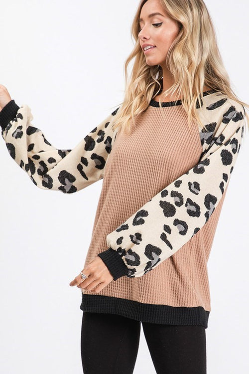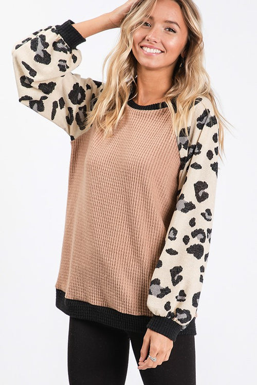 Runnin Wild Leopard Print Balloon Sleeve Knit Waffle Top