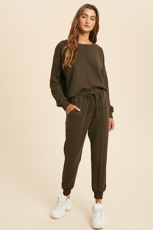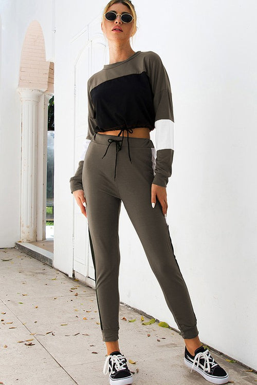 Fueled By Coffee Long Sleeve Splicing Two Piece Set - Olive