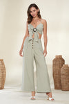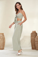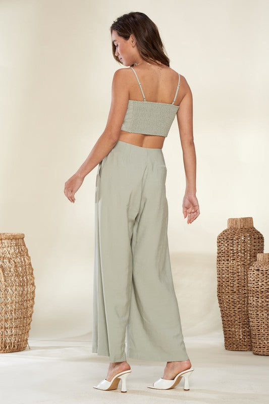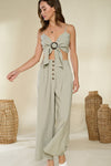 Perfect for the spring and summer months, this two piece set is both comfortable and cute! The cropped bandeau top features a front o-ring buckle, adjustable straps and a smocked back. The bottoms feature buttons down the front, a wide leg fit and front side pockets. Model height is 5'9" and wearing a size small.