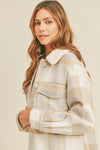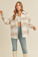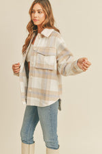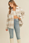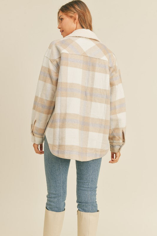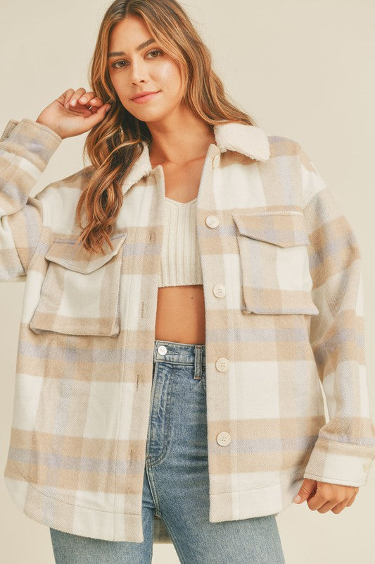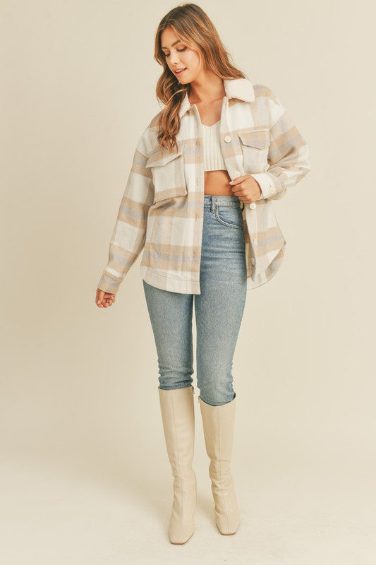 We're mad about plaid! This cozy plaid shacket boasts the print you love in neutral colors with a hint of blue. The perfect layering piece, this cozy shacket can be paired with jeans, skirts, leggings and beyond.