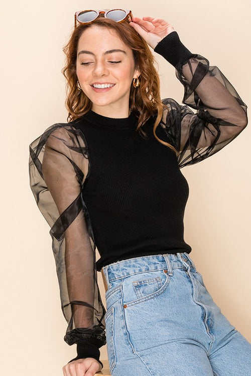Cinch Puff Shoulder Mock Neck Bodysuit