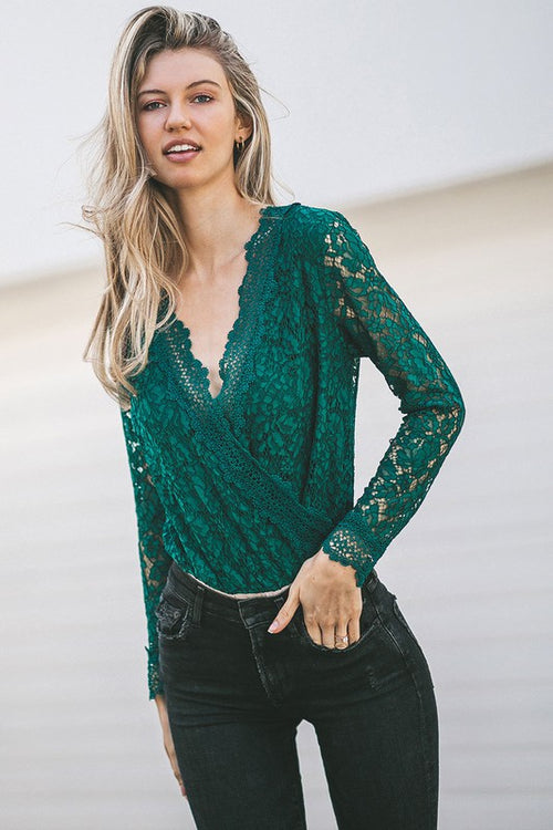 Angeletta Scallop Lace Long Sleeve Bodysuit - Fanfare Green